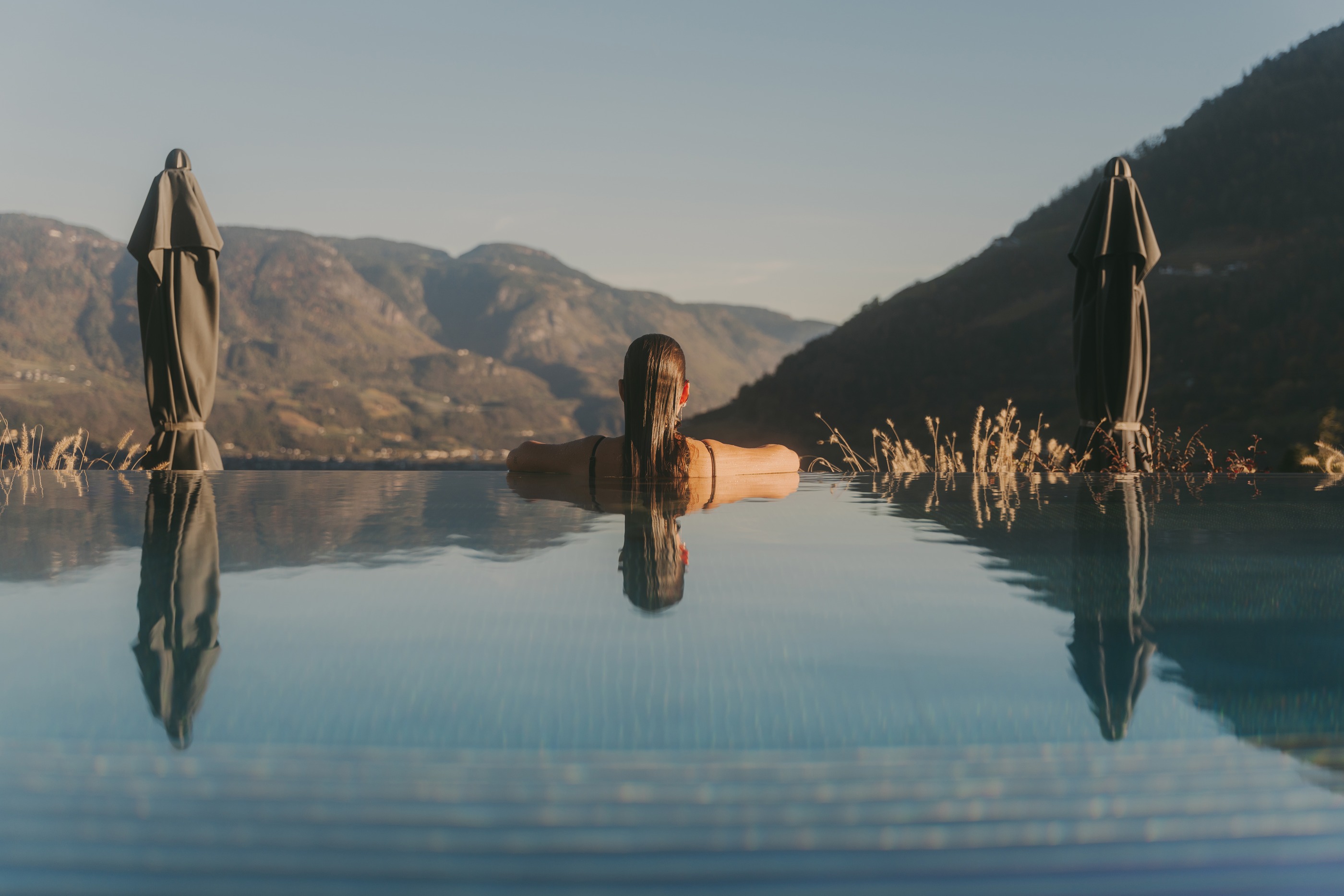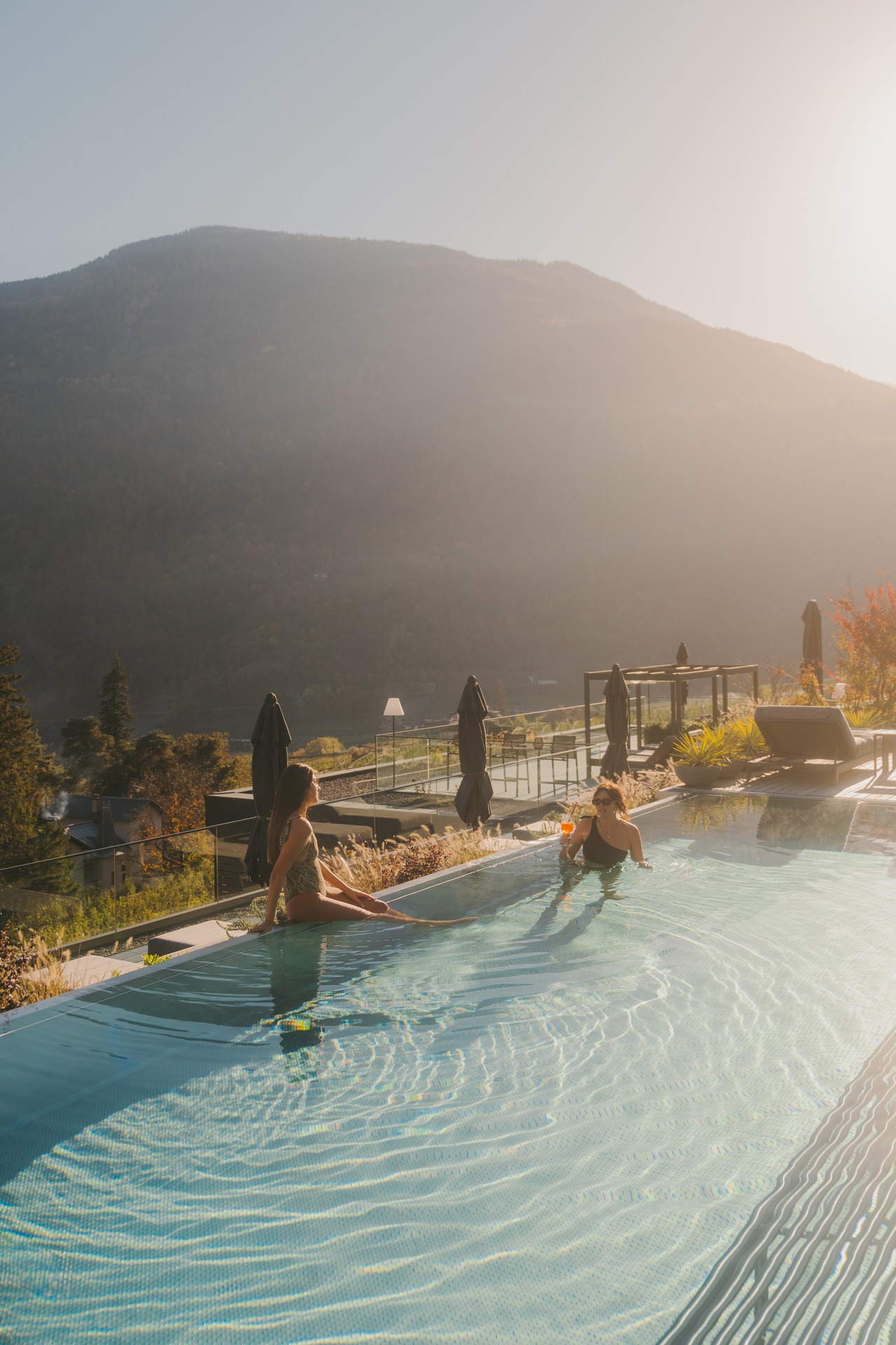 Auf der Panorama-Dachterrasse im vierten Stock genießt ihr den Sky-Pool und Whirlpools mit 360° Bergpanorama über Meran bis zu den Dolomiten.